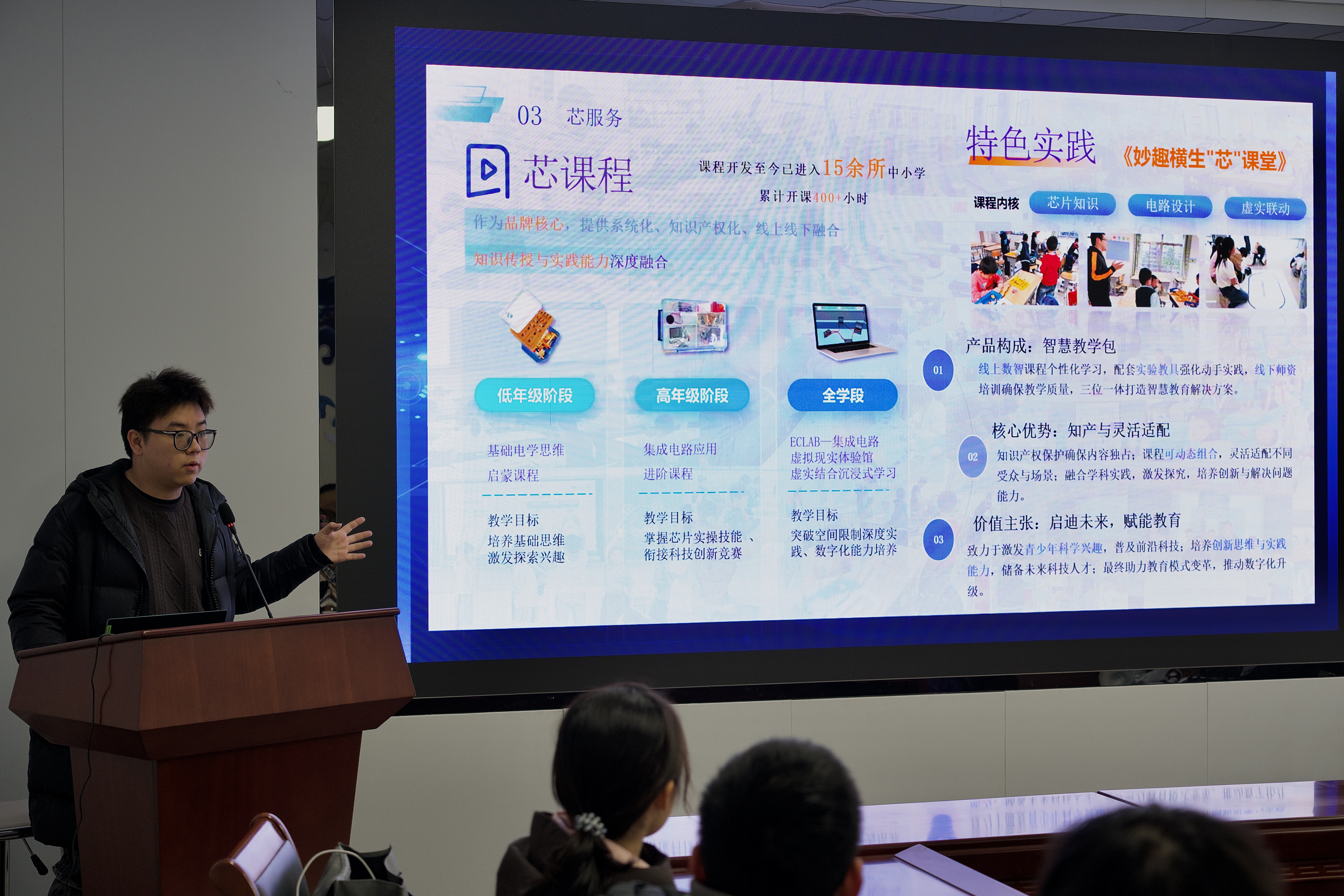 随后,清华大学“E智宁常”实践队代表陈焕翔聚焦核心议题,分享了集成电路技术在生命健康领域的应用实例与科普经验。从技术落地场景到科普宣讲策略,实践队的分享为跨学科科普提供了鲜活样本,也契合了栖霞“生物医药+集成电路”双轮驱动的产业发展布局。