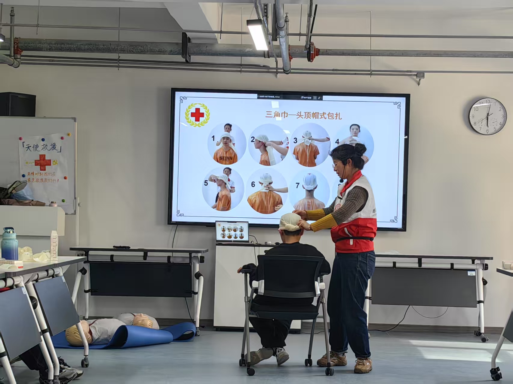 下午的实践环节,将科普学习与应急技能培训推向深入,成为本次冬令营的亮点所在。栖霞区科协协同栖霞区红十字会,邀请专业应急救护师资开展现场教学,重点指导孩子们学习利用三角巾及日常衣物进行头部包扎的方法。一双双小手仔细折叠、认真缠绕,尽管动作尚显生涩,但每一个步骤都一丝不苟。随后的急救技能观摩环节,老师通过模拟人规范演示心肺复苏(CPR)的完整流程,从正确按压、开放气道到人工呼吸,每一个细节都讲解细致、示范标准,孩子们围站四周、专注观察,并不时提问请教,在老师的指导下积极尝试模拟操作,在实践中感悟生命敬畏,在体验中强化责任担当。
