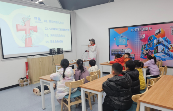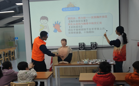 活动中,在CPR心肺复苏术学习区,专业志愿者通过讲解和示范,教授孩子们如何准确判断意识、正确进行胸外按压以及实施人工呼吸。孩子们围在模拟人偶周围,聚精会神地观察着每一个动作要领,随后亲身体验“生命救援”操作。