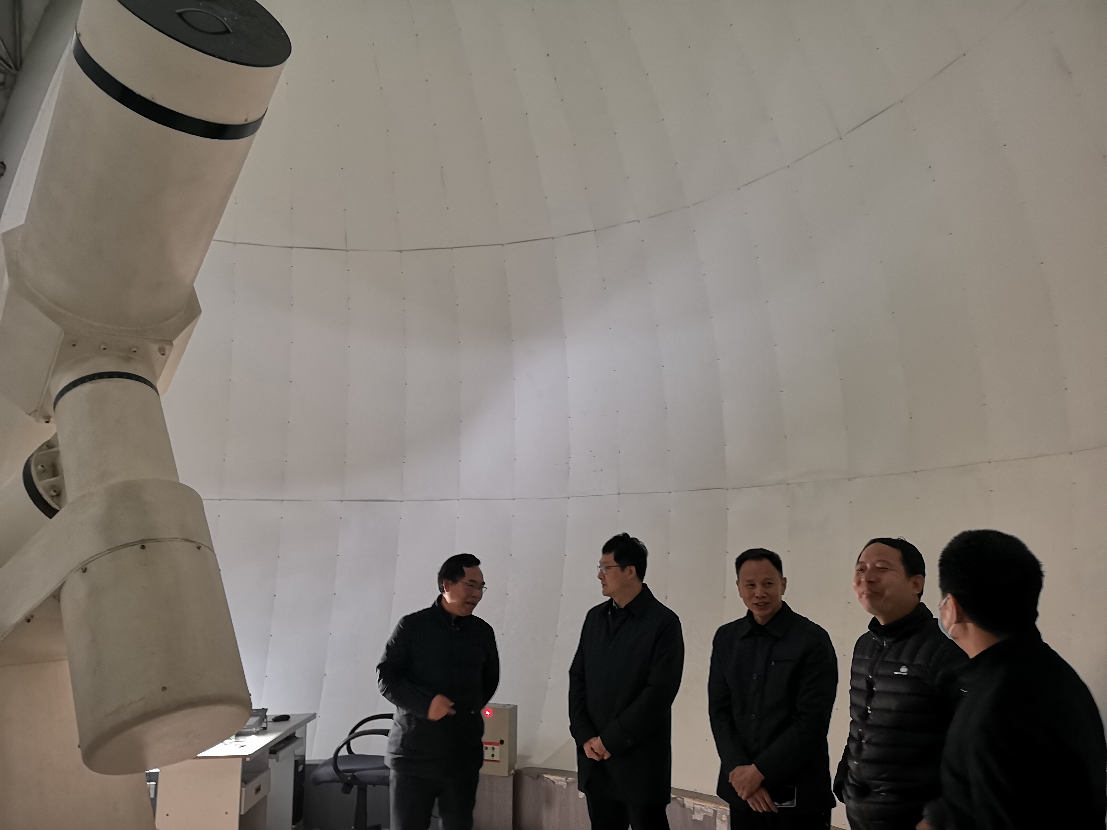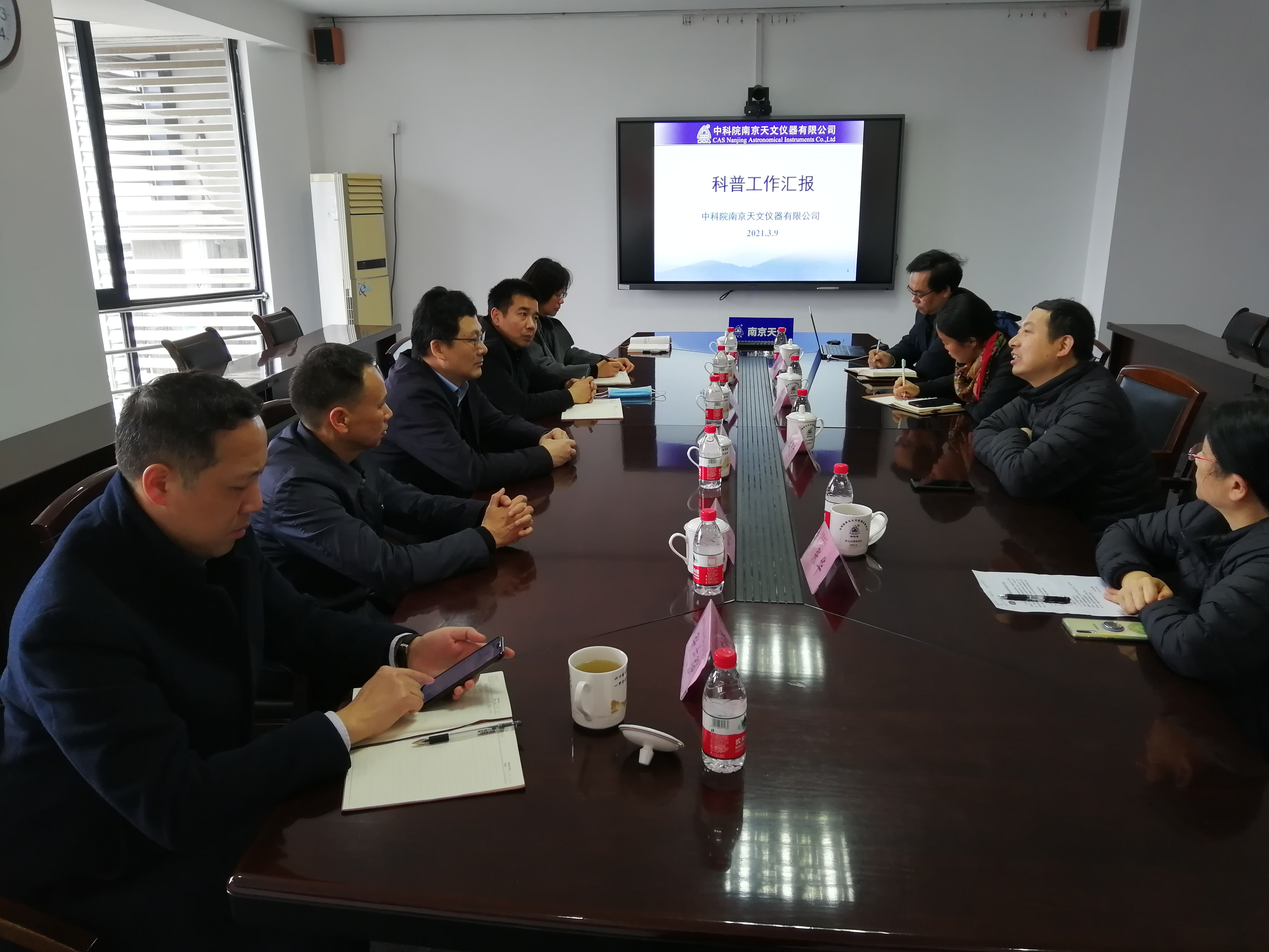 在中科院南京天文仪器有限公司,王进步总经理和朱庆生研究员分别介绍了公司的发展历史、科技成果和近年来科普工作的开展情况。调研组随后参观了天仪公司所属天文台配备的直径9米天文圆顶和40cm口径卡塞格林望远镜等设备。