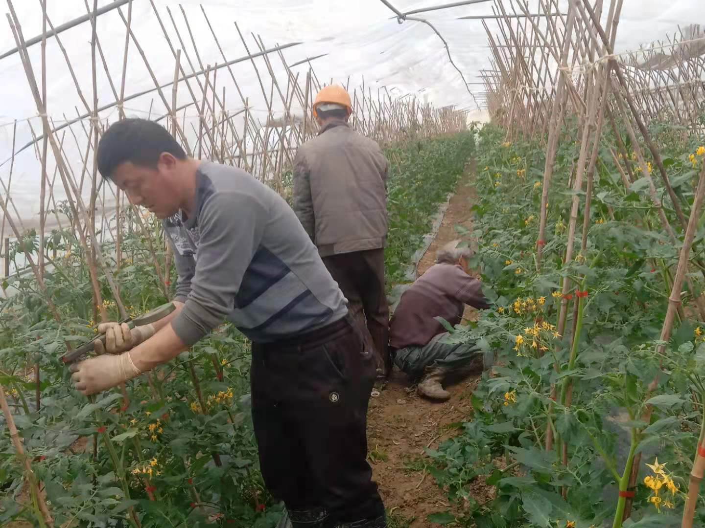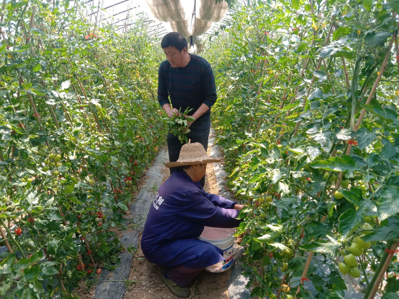 5月13日上午,在高淳区固城街道花联村陈坤云经济果林家庭种农场的果蔬大棚里,果农们正喜笑颜开地采摘圣女果,一派丰收场景。