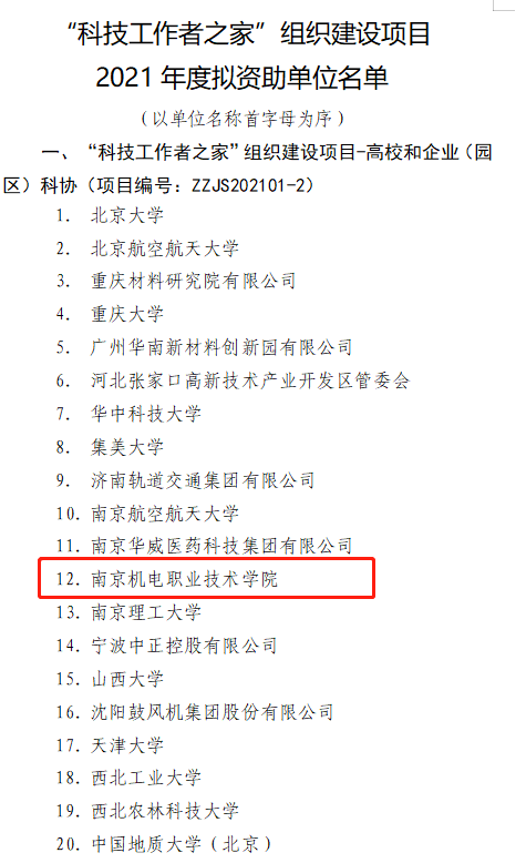 近日,中国科协公布了2021年度“科技工作者之家”组织建设项目立项结果,由南京市高淳区科协指导推荐、南京机电职业技术学院实施申报的《高校和企业(园区)科协》成功立项。全国20个获批立项中,南京机电学院成为全国唯一一个获得立项的高职院校。