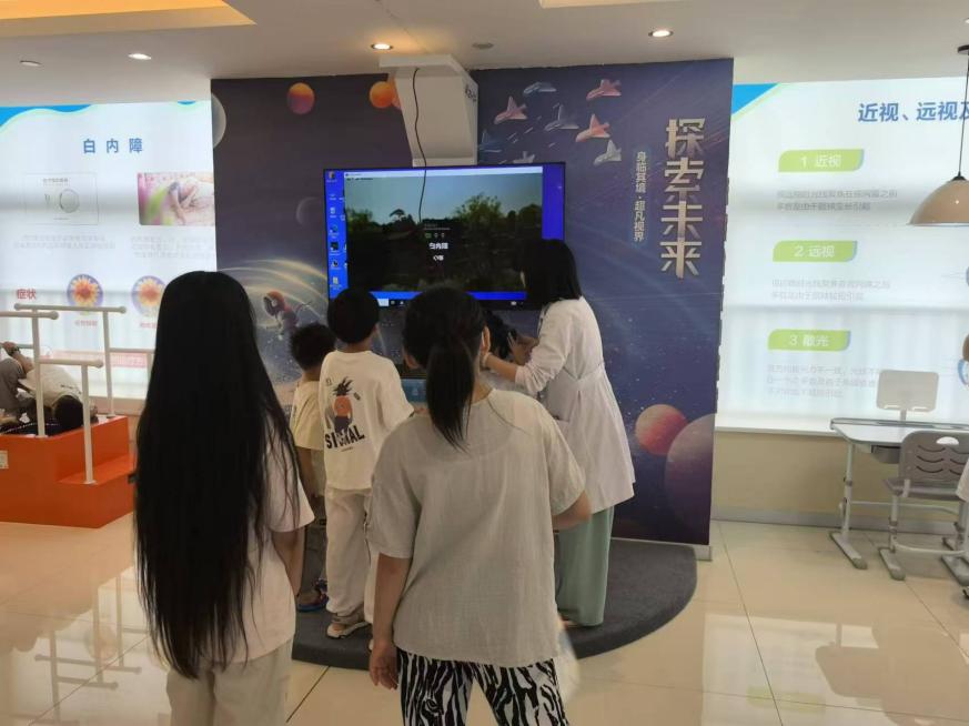 在VR体验区,大家戴上VR眼镜,在讲解老师的指导下,体验了高度近视、白内障、飞蚊症、视网膜脱落等患者眼中的世界,使青少年更加深了对爱眼护眼重要性的认识。