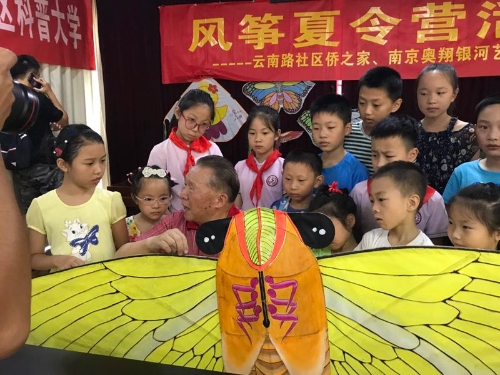 8月20日,云南路社区科普大学联合侨联和南京奥翔银河艺术风筝协会在云南路社区科普大学举办青少年风筝夏令营科技活动。 活动现场,南京市政协委员、南京奥翔银河艺术风筝俱乐部创始人,著名的国际风筝明星,87岁高龄的台胞赵铜会长,给孩子们讲解了风筝的起源,以及风筝的扎、糊、绘的制作方法,孩子们听的聚精会神。云南路社区科普大学科普志愿者把准备好的白底风筝发给孩子们,孩子们就迫不及待的挥起了手中的画笔,一会功夫色彩斑斓的风筝就画好了,画好风筝后,大家便开始放飞,科普志愿者们带领大家来到了中心广场,各色各样的风筝一会儿的功夫就飞满。