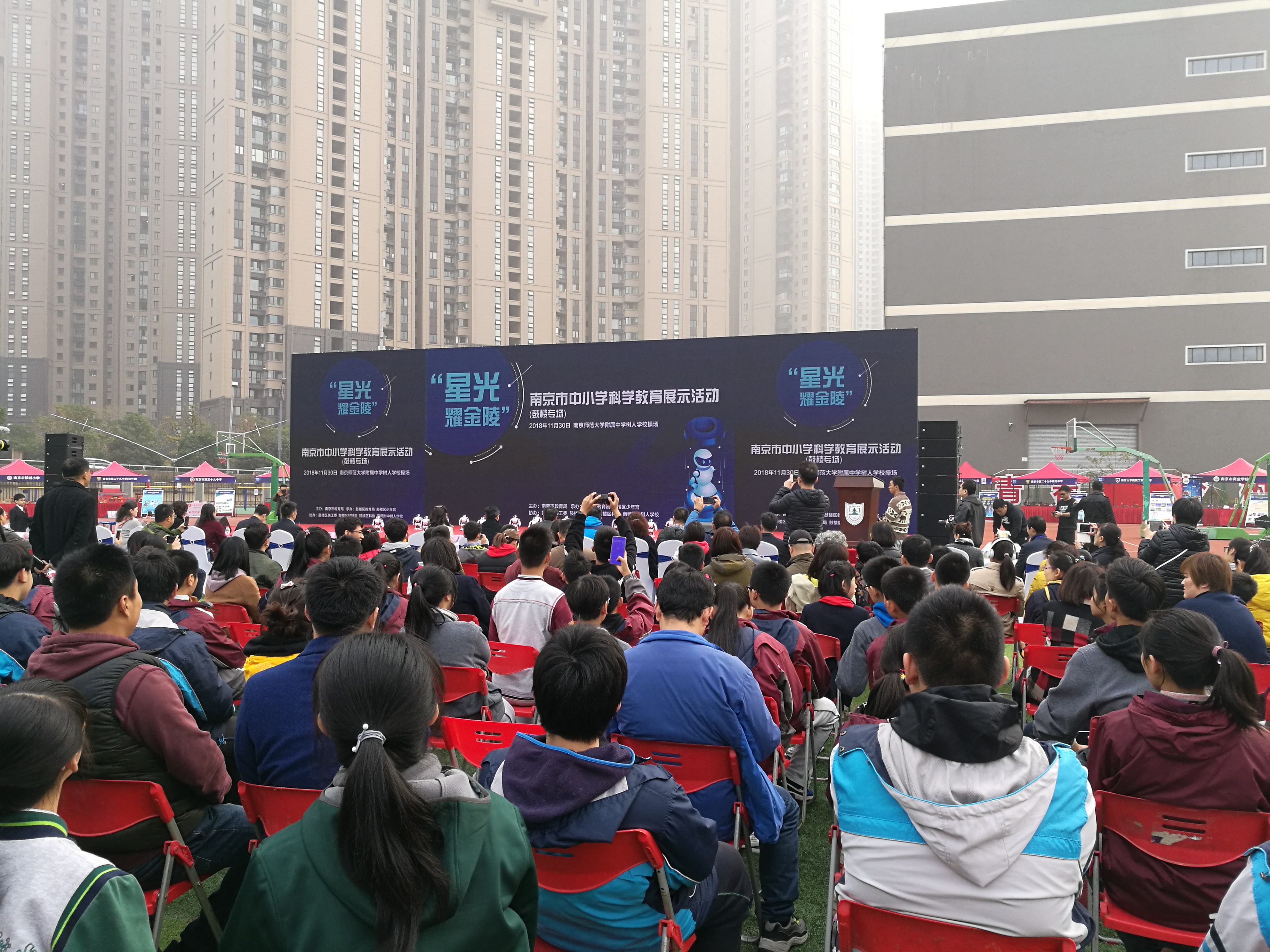 11月30日下午,由南京市教育局主办,鼓楼区教育局、科协、科技局、关工委、南师附中树人学校等联合承办的南京市科学教育展示活动鼓楼专场——“星光耀金陵”在南师附中树人学校体育场拉开帷幕。市教育局副局长周鹏,鼓楼区教育局副局长谢晓富、科协副主席许启明、科技局副局长杜敏等有关部门负责同志,区少年宫、各中小学分管同志,南师附中树人学校师生及家长近500人参加活动。