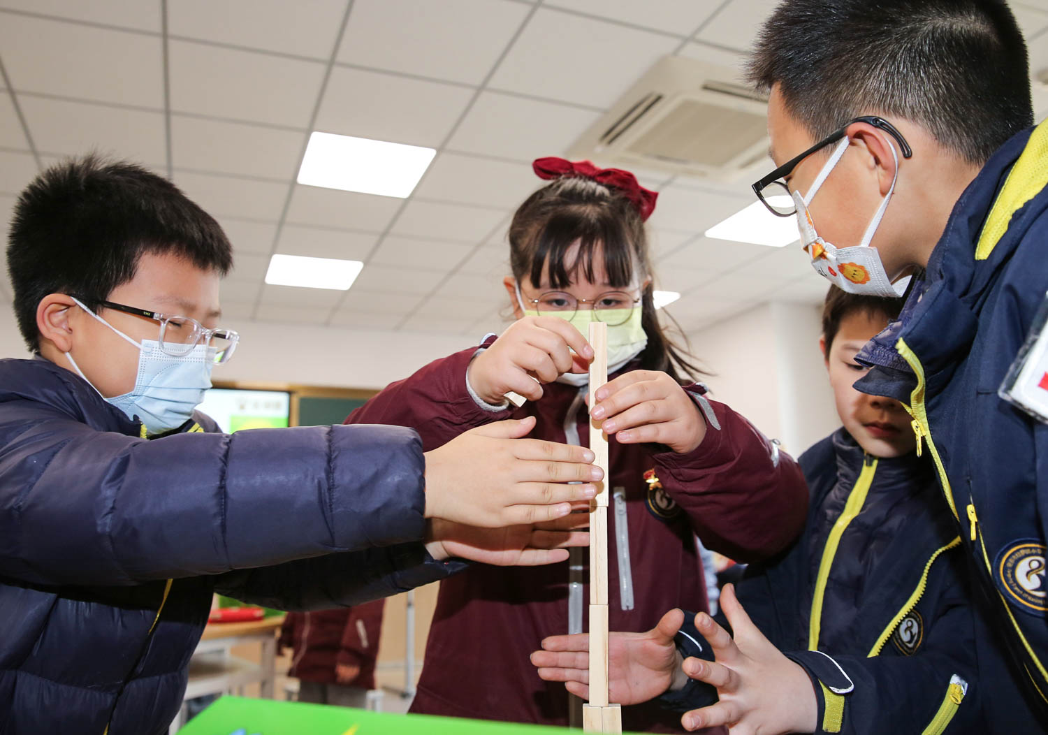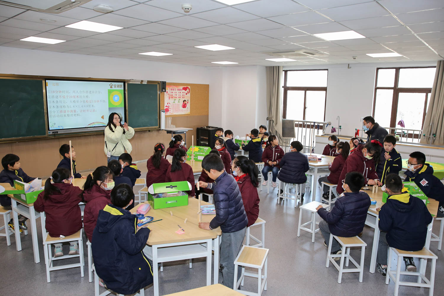 “同学们,现在请大家动手,用手中的道具搭建起一座摩天大楼,看看谁搭得又高又快又稳……”在该校的科学教室里,科学老师杨帆正带领3、4年级学生进行金钥匙科技工坊科学课。