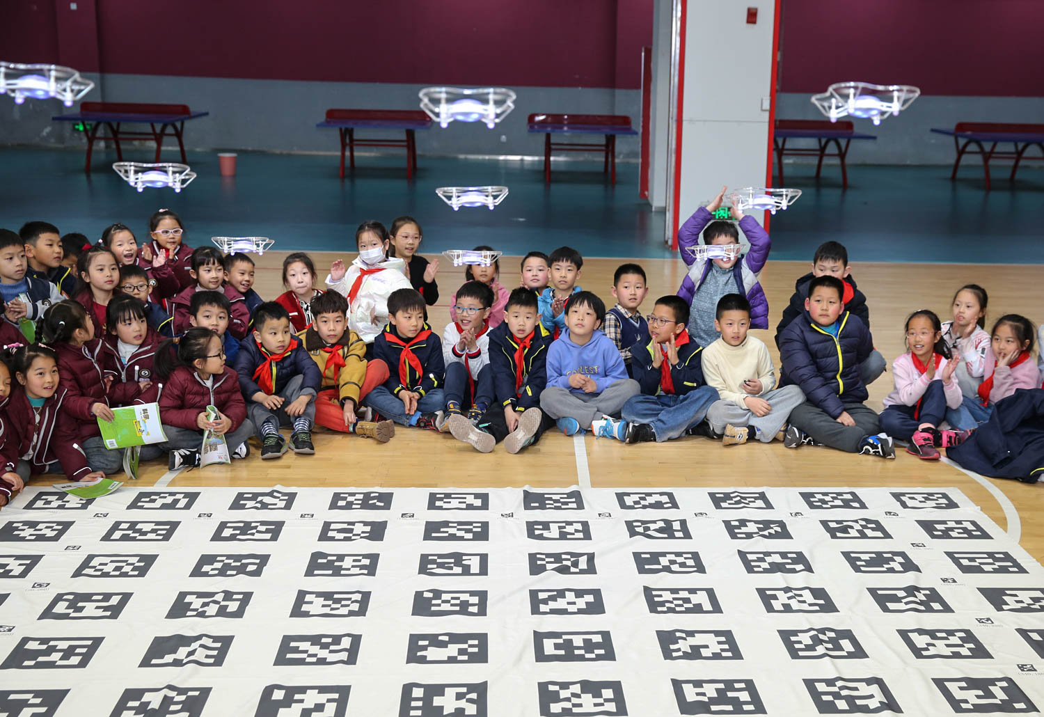 “老师,地板上的这些黑色的小格子有什么用?”在无人机表演结束后,一个学生向张杰提出问题。张杰回答道:“你们看,这些小格子像不像一个个二维码?正是它们的存在,这些在空中的无人机才知道自己应该站在什么位置,排成什么队形,就像你们在舞台上表演节目需要排成一定的队形,老师们会在地上给你们事先画好格子,这样你们就不会站错地方了。”