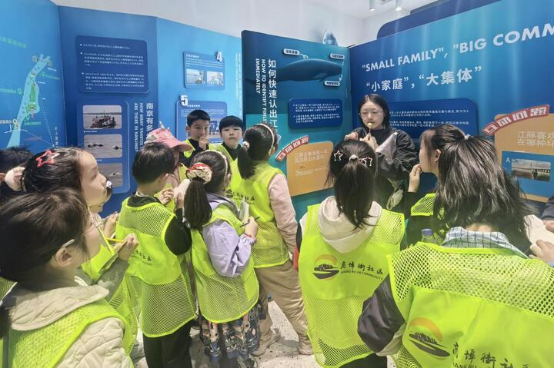 活动伊始,来自南京江豚水生生物保护协会的专业讲解员化身“科普老师”,一连抛出数个问题,引导孩子们主动探寻答案,逐步了解长江江豚作为国家一级保护野生动物的生物学特征、其作为长江生态“活化石”与“风向标”的重要意义,也认识到南京作为长江流域唯一市中心江段有野生江豚稳定栖息大城市的独特生态价值。生动的讲解与直观的展陈,让“保护江豚、守护长江”的种子悄然扎根童心。
