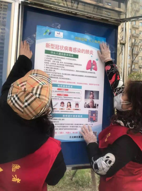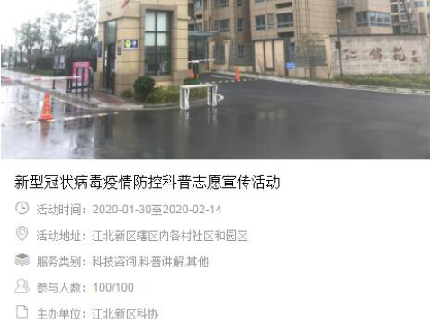 新型冠状病毒疫情暴发后,江北新区科协积极响应市科协和新区党工委和管委会号召,立即投入到疫情防控重要工作中来。1月28日起每日在“科创江北”微信公众号上转发科普中国“科学预防新冠病毒感染肺炎”专题文章及视频,1月30日紧急拨付街道平台疫情防控科普专项资金,同时在科普志愿服务微信公众号发布了“疫情防控科普志愿活动”,号召新区广大科技志愿者积极投身到当前新型冠状病毒疫情防控活动中来。活动发布不到两天时间,100人的报名名额就已报满,广大科技志愿者在新区各街道社区、各园区企业开展了与新冠肺炎疫情相关的包括防控知识科技咨询、科普讲解、张贴科普海报、发放《江苏科技报》防疫专刊、心理疏导、提供生活服务等形式多样、丰富多彩的志愿活动。