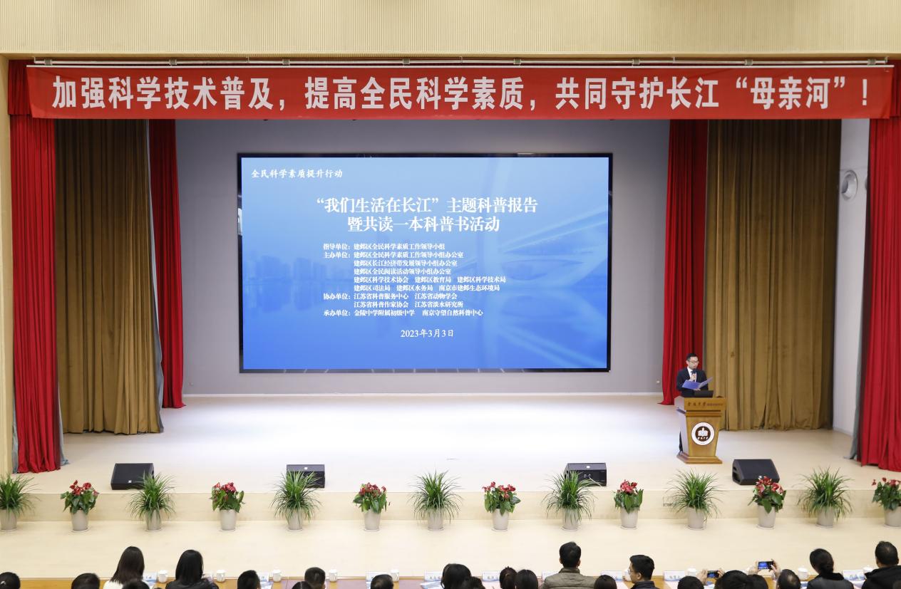 2023年3月3日,值《长江保护法》正式实施两周年、第10个“世界野生动植物日”之际,由建邺区科协发起,联合区全民科学素质领导小组相关成员单位在金陵中学附属初级中学举办“我们生活在长江”主题科普报告暨共读一本科普书活动,宣传《长江保护法》,多层面解读长江,普及科学知识,协力共护“母亲河”。区委宣传部、区发改委、区教育局、区科协、区科技局、区司法局、区水务局、建邺生态环境局相关领导及金中附初全体师生约200人参加活动。
