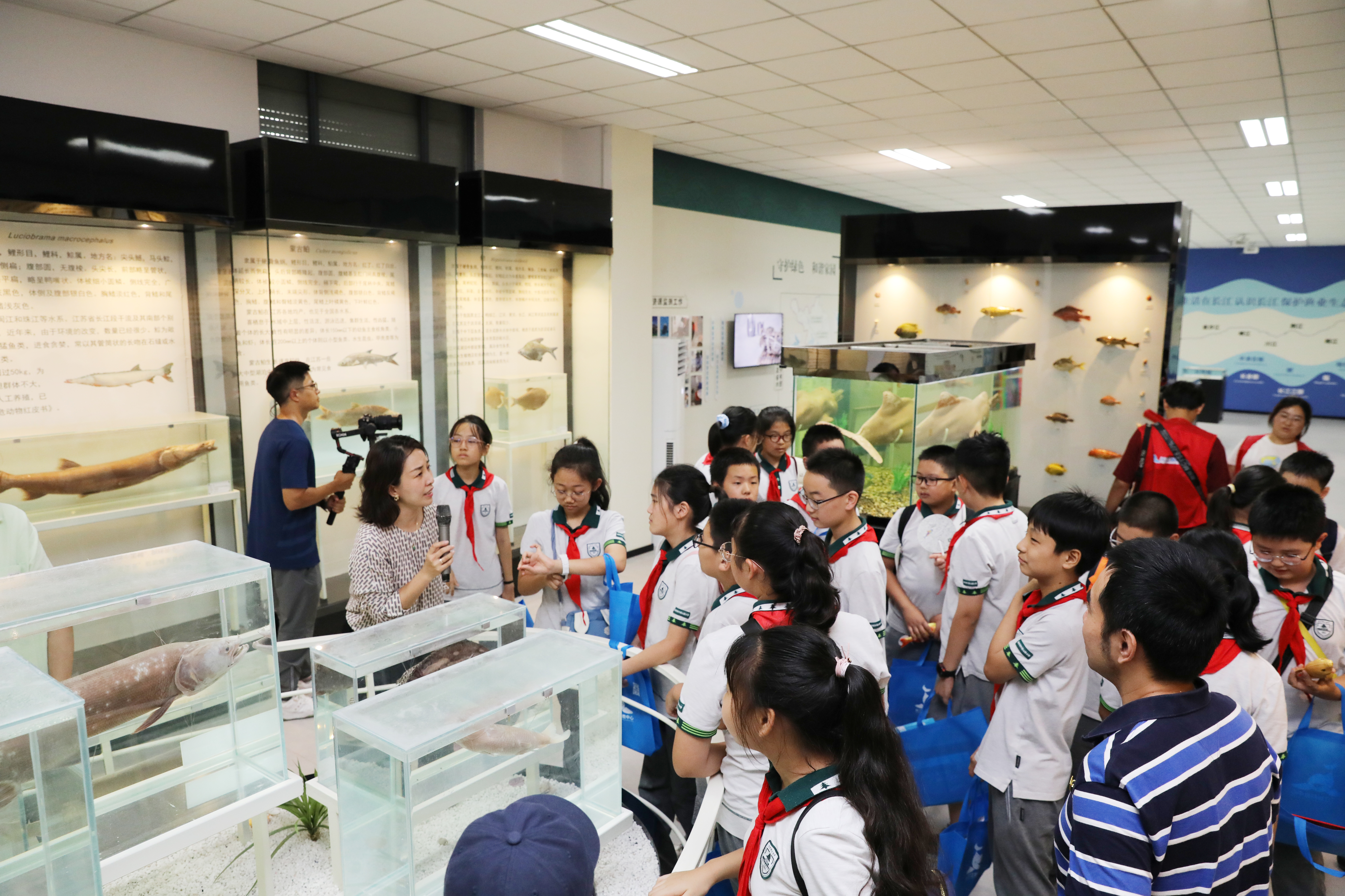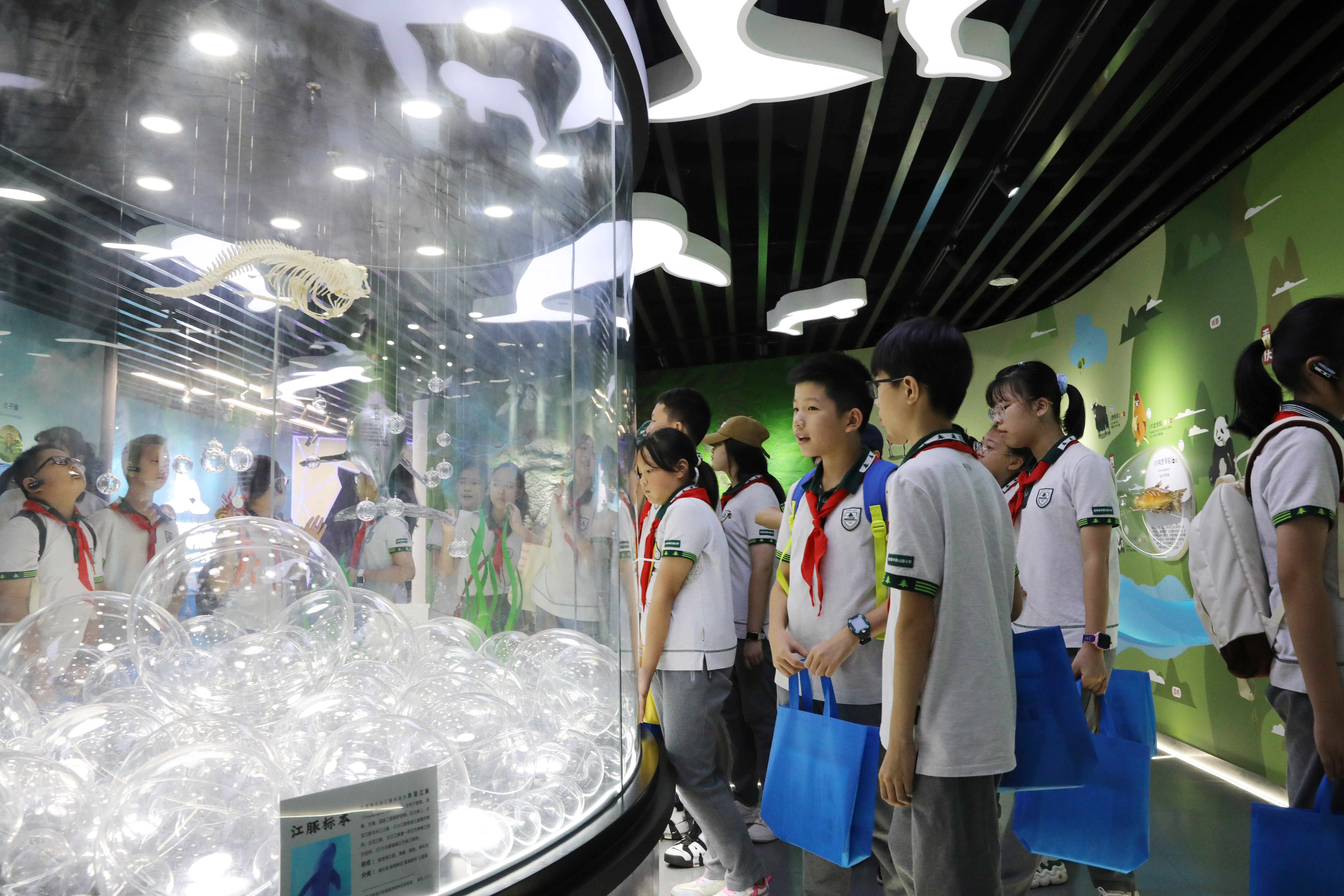 第一站小记者们来到江苏省淡水水产研究所,参观江苏渔业生态资源保护科普体验馆,倾听工作人员讲述标本的来源及制作过程,近距离观察长江珍稀濒危水生生物—白鱀豚、中华鲟等标本,了解长江特色淡水鱼类。参观之余,也开展了紧张刺激的知识问答环节,小记者们积极参与抢答。