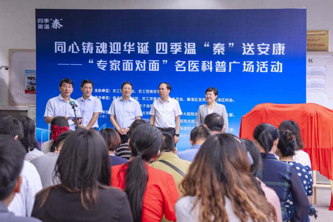 中共秦淮区委副书记陈慧男,区委常委、统战部部长还建军等领导应邀出席,并为秦淮区荣获农工党中央和江苏省委会“社会服务基地”揭牌。活动现场,还建军发表热情洋溢的致辞,他表示秦淮区“四季皆温‘秦’”便民服务活动自启动以来,常态化深入社区一线服务,开展医疗、救助、教育等系列便民服务受到了广大居民群众的欢迎和认可。同心铸魂迎华诞 四季温“秦”送安康 --“专家面对面”名医科普广场活动,是民主党派社会服务工作与中共秦淮区委便民服务工作的有效结合,实现了活动共办、责任共担、资源共享、最终群众受益模式的有益探索。