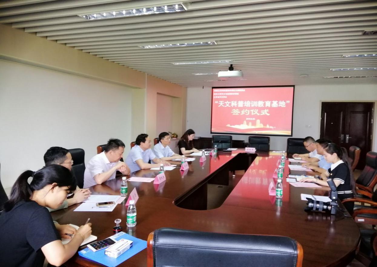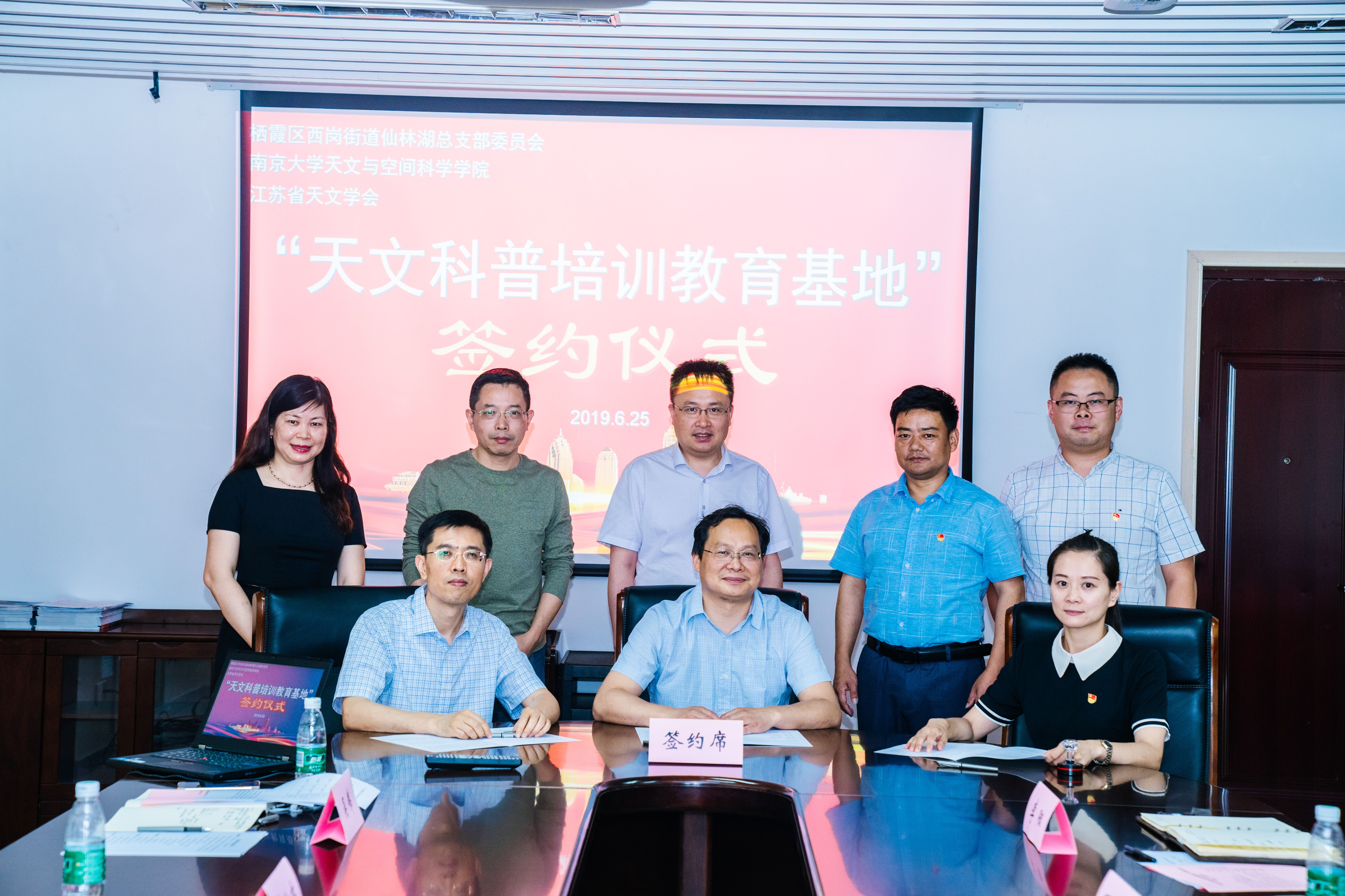 2019年6月25日,江苏省天文学会、南京大学天文与空间科学学院、西岗街道仙林湖总支部委员会三方在南京大学天文与空间科学学院举行“天文科普培训教育基地”共建协议签约仪式。江苏省天文学会理事长周济林教授、南京大学天文与空间科学学院院长李向东教授、党委书记顾秋生教授、江苏省天文学会天文科普与教育工作委员会主任张旸研究员、江苏省天文学会秘书长吴伟研究员、西岗街道办事处夏建国副主任及仙林湖党总支成员出席活动。