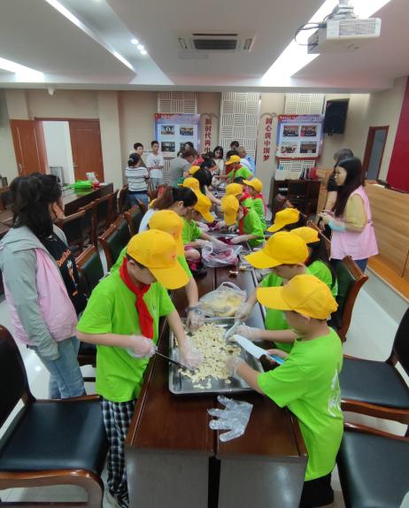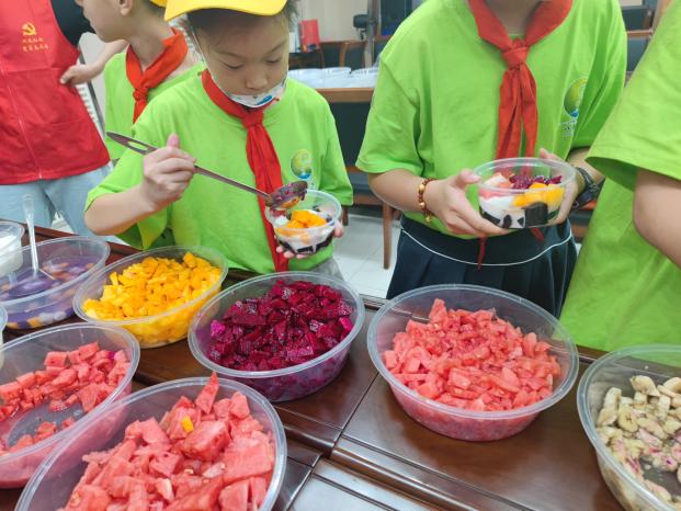 冰粉制作正式开始,志愿者首先播放了冰粉制作视频,然后向孩子们详细讲解了冰粉的制作流程,最后,要求孩子们亲手进行实践,分工合作,切水果、煮芋圆、混合放凉……,此刻孩子们眼神里满是认真与专注。最终,在志愿者的指导下,所有材料制作完成,整齐摆放在桌上。