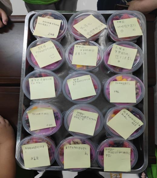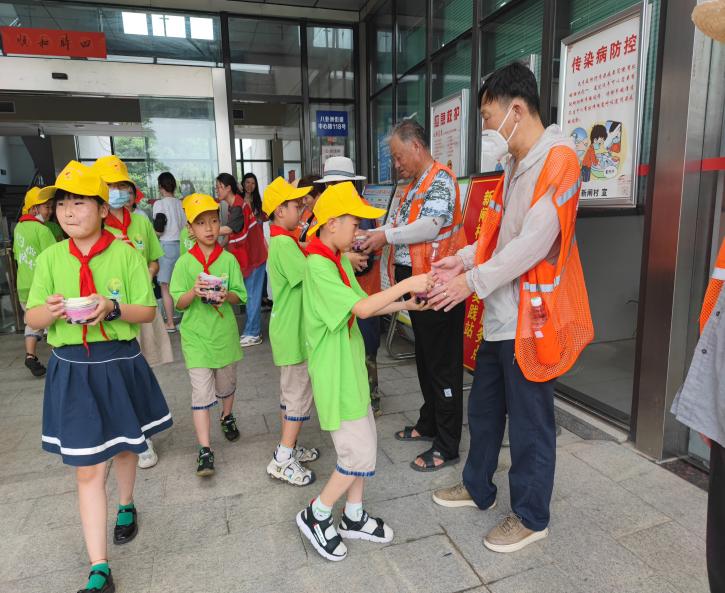 冰粉装盒后,孩子在盒子上贴上带有慰问话语的暖心小纸条,然后将一个个打包好的冰粉送到附近干活的保洁员手中,“爷爷,您辛苦了,这是我亲手做的冰粉,我要送给您。”孩子们一句句“您辛苦了”是对保洁员最大的肯定。谢谢你们了哦,”接过“清凉礼包”,保洁员们乐得不行,感谢这群可爱的小小志愿者。最后,小朋友们才坐下来享受自己劳动成果,“我回家要做给爸爸妈妈吃,让他们都能品尝到美味的冰粉,”李锦宸小朋友开心的说道。