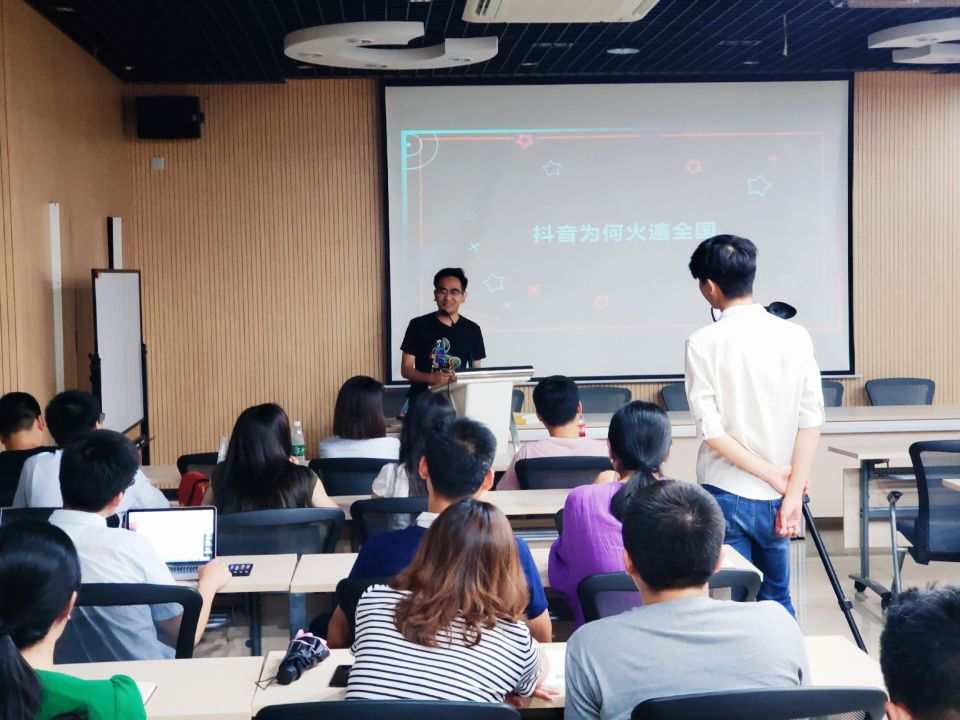 张老师的讲解幽默风趣、并直观的用图片与视频进行展示,通过“短视频的起源和发展”、“平台与短视频的内容”、“短视频行业的盈利模式”、“抖音短视频的玩法解析”、“企业短视频如何操作”五个篇章,向大家介绍了短视频相关产业的主要内容、特点等理论知识,着重分享了“抖音”为何火遍全国及腾讯、百度、阿里等互联网巨头各自对外发布的短视频战略,使大家了解了其背后的商业价值和盈利模式。活动过程中张老师还与学员们进行了现场互动并录制了短视频,增强了大家的积极性与参与性。