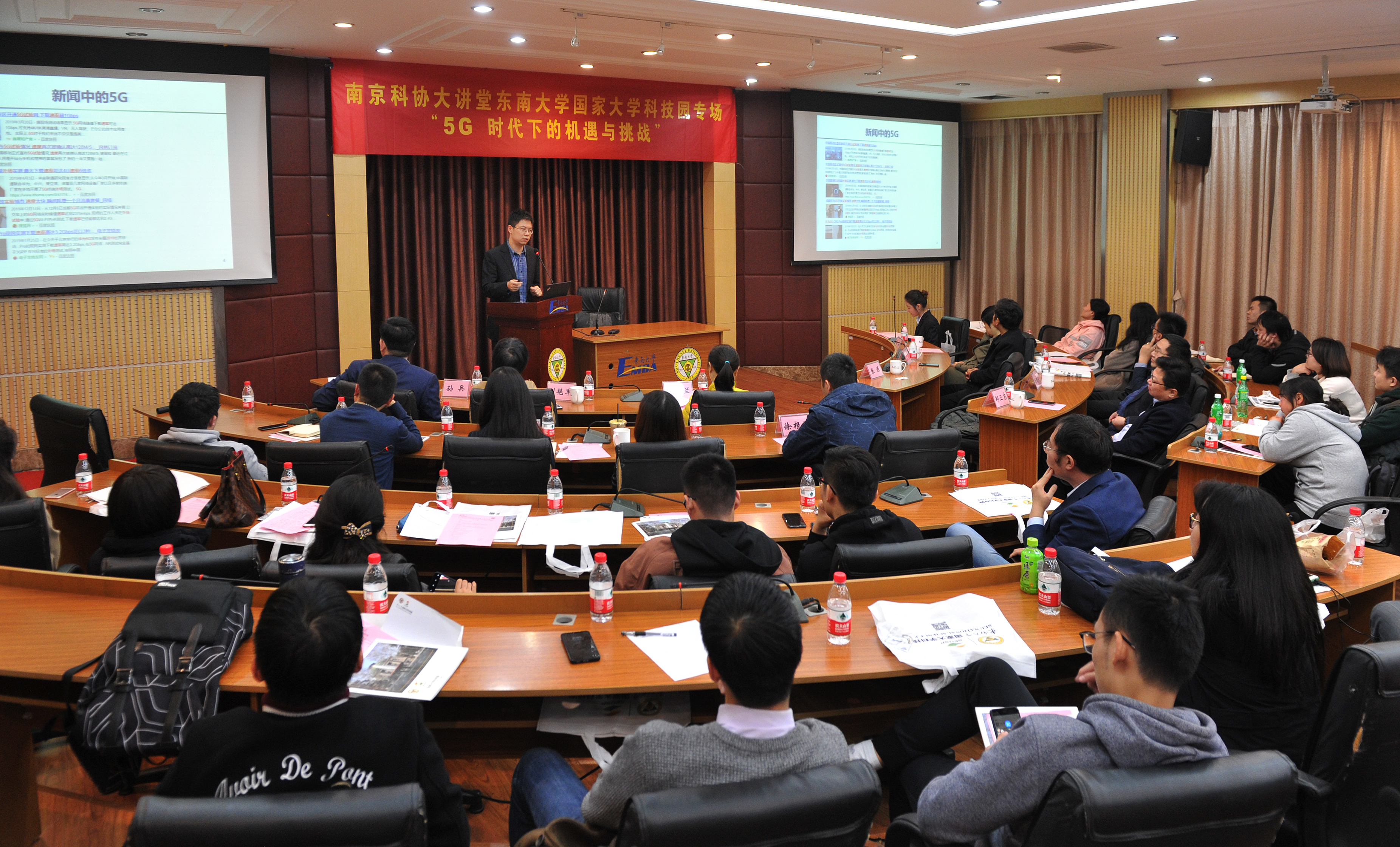 11月22日下午,由南京市科学技术协会主办、南京市珠江路科技街科学技术协会、东南大学国家大学科技园联合承办的2019年第95期(总第837期)南京科协大讲堂“5G 时代下的机遇与挑战”在东南大学四牌楼校区成功举办。本期大讲堂邀请到了东南大学移动通信国家重点实验室研究员、信息科学与工程学院通信工程系副主任张源作科普报告。南京市科协企事业部张玉兰,玄武区科协刘艳军,珠江路科技一条街管理委员会办公室党组书记、主任孙兵,东大科技园总经理、珠江路科技街科协主席贾方,东南大学南京校友会、校友经济网伍晓红等嘉宾出席本次活动。来自东大科技园各园区的企业家、科技工作者以及学生等100余人参加活动,现场人气爆满,座无虚席。活动同时得到了玄武区科协、东南大学南京校友会、东南大学双创联盟的大力支持。